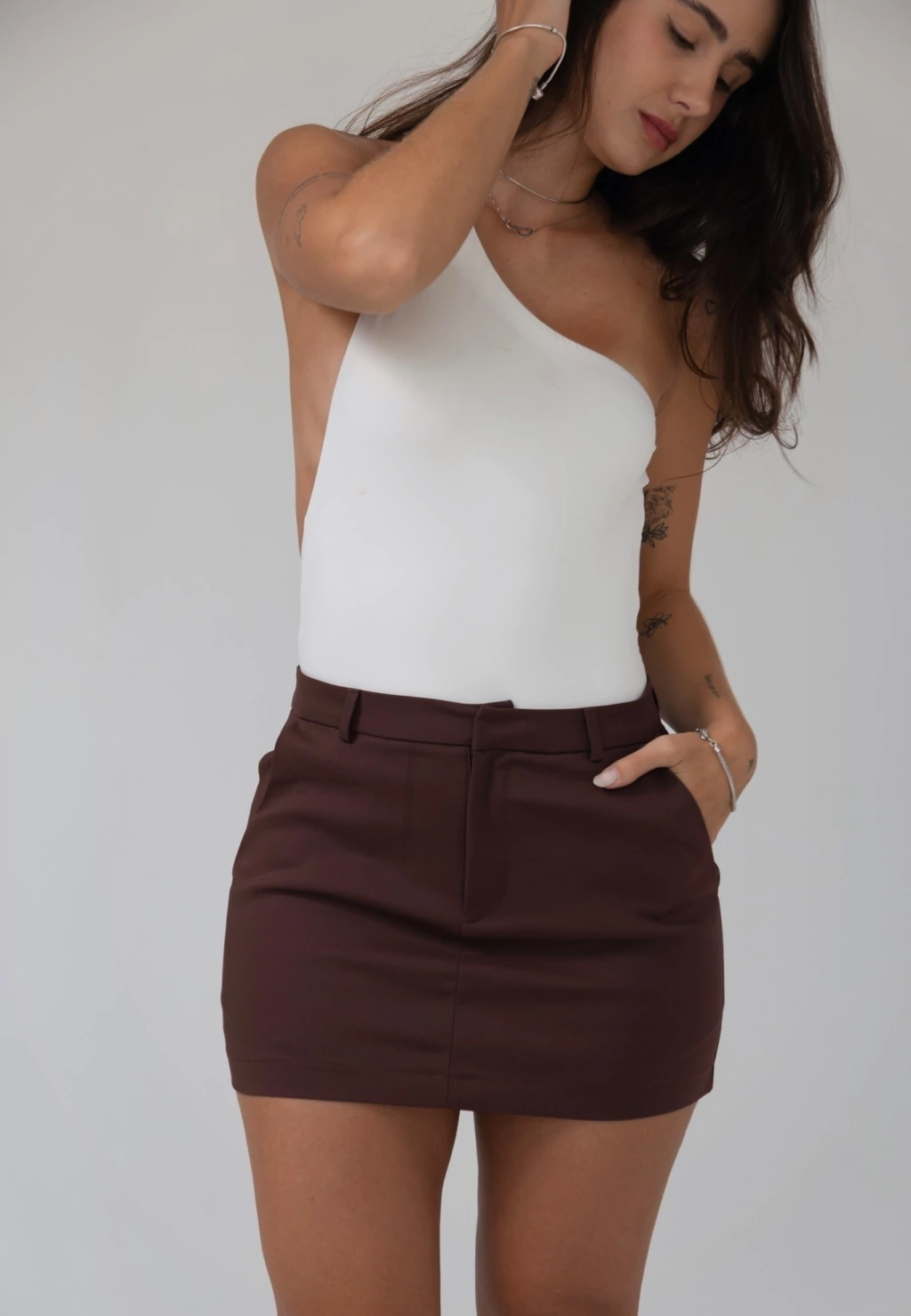 Detalhes: design com bolsos traseiros falsos e bolso lateral no estilo “faca”. Minimalista essencial. Cintura média.